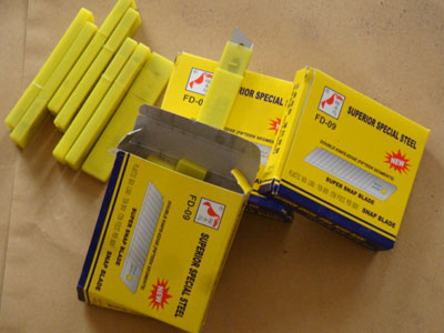 美工刀也俗稱刻刀或壁紙刀,是一種美術和做手工藝品用的刀,主要用來切割質地較軟的東西,多為塑刀柄和刀片兩部分組成,為抽拉式結構。也有少數為金屬刀柄,刀片多為斜口,用鈍可順片身的劃線折斷,出現新的刀鋒,方便使用。美工刀有大小多種型號。